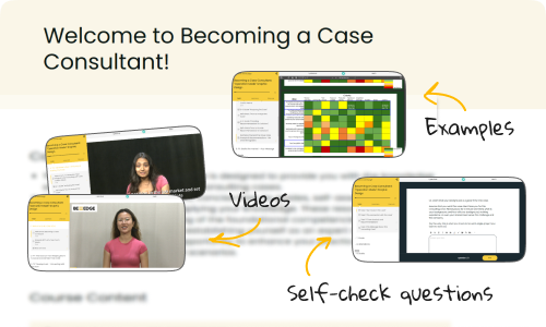 “Becoming a Case Consultant” course provides the fundamentals to becoming a proficient case consultant. Through a blend of engaging real-world case studies and hands-on assignments, you will develop the essential skills needed to excel in this dynamic field. You’ll gain practical knowledge that can be applied immediately in the consulting arena.