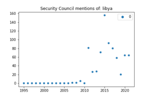 For example, this simple scatter plot I created in one of my data science classes illustrates how often the United Nations Security Council Resolutions mention Libya in the last 20 years. Notice the uptick in 2011 which corresponds to the first Libyan civil war and the subsequent intervention of a NATO-led coalition. Having this knowledge is key in making me a well-rounded individual. I obtained a lot of this knowledge through my involvement in the Northeastern University International Relations Council, a competitive model debate team on campus where I was also the treasurer and helped organize travel (another useful quality: event and travel planning).